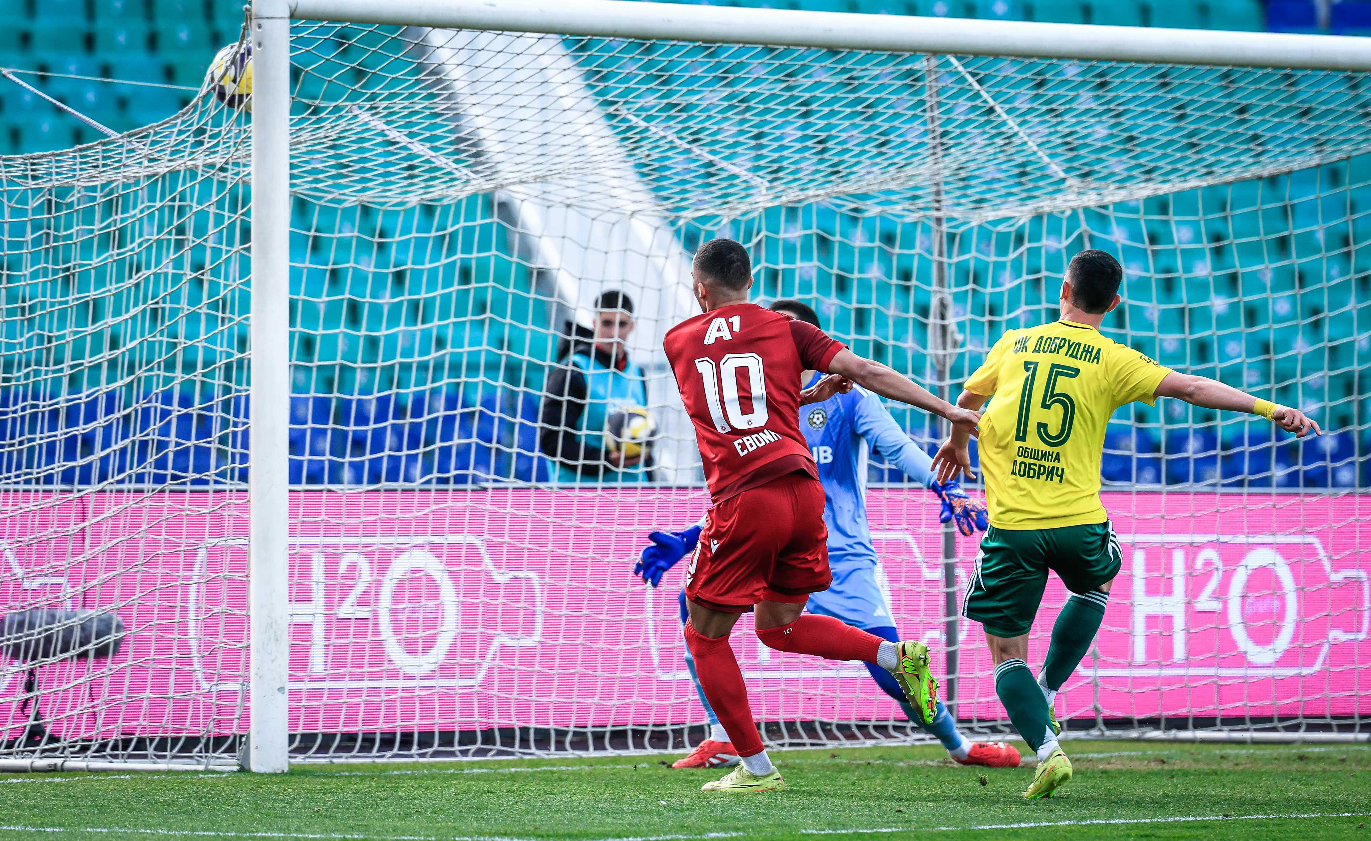 ⚽44'- ГОООЛ ЗА ЦСКА! 1:0! МАКС ЕБОНГ! Минутите на първото полувреме почти се изнизваха и от лагера на Добруджа виждаха как ще успят да задържат нулевото реми...Не така обаче мислеха футболистите на Христо Янев, които удариха опонента си 60 секунди преди сигнала за пауза. Малко преди това Христо Янев бе завъртял крилата си, а това доведе до много добра комбинация отдясно между Етоо и Лео Перейра. Бразилецът центрира към далечната греда, където Макс Ебонг изпревари Богдан Костов и отблизо реализира за 1:0.