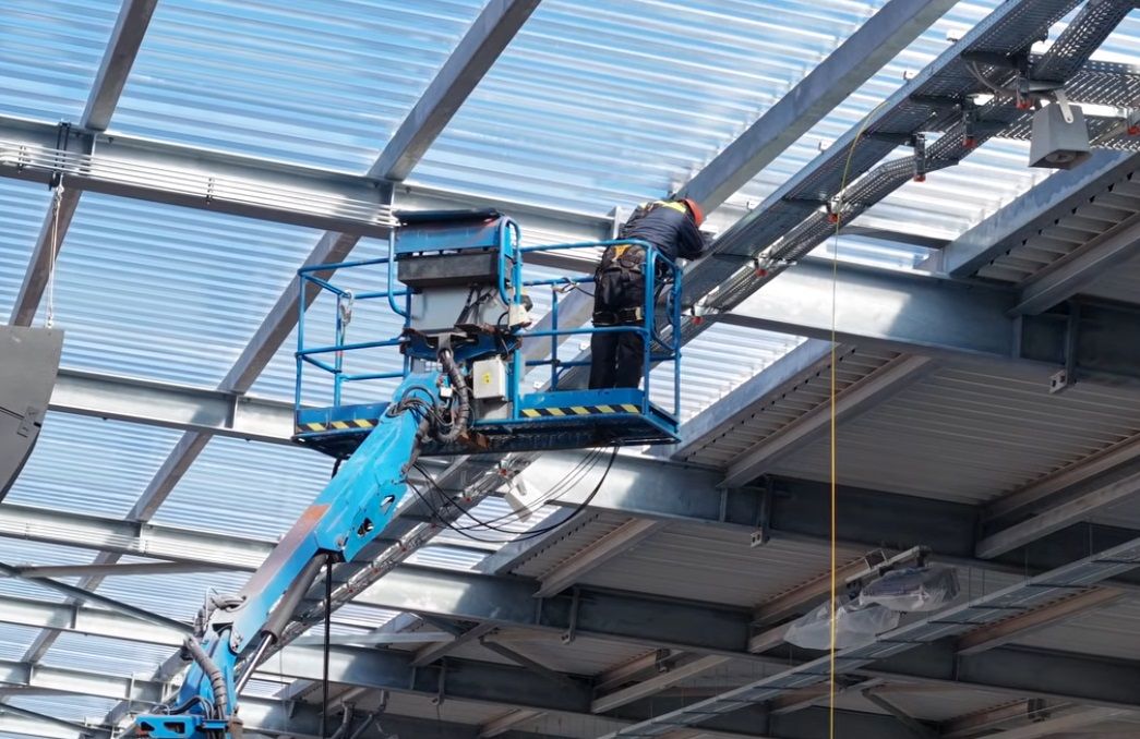На покрива на Сектор А има складирани доста материали – крепежи, изолация и елементи за довършване. Очаква се освен чилърите да бъдат поставени и слънчеви панели. Работници подготвят зоната за монтажа, а вече се виждат и трасета, по които вероятно ще се свързват външните тела с вътрешната инсталация.