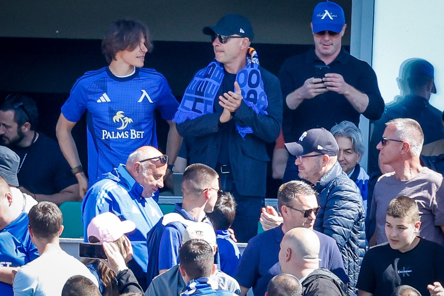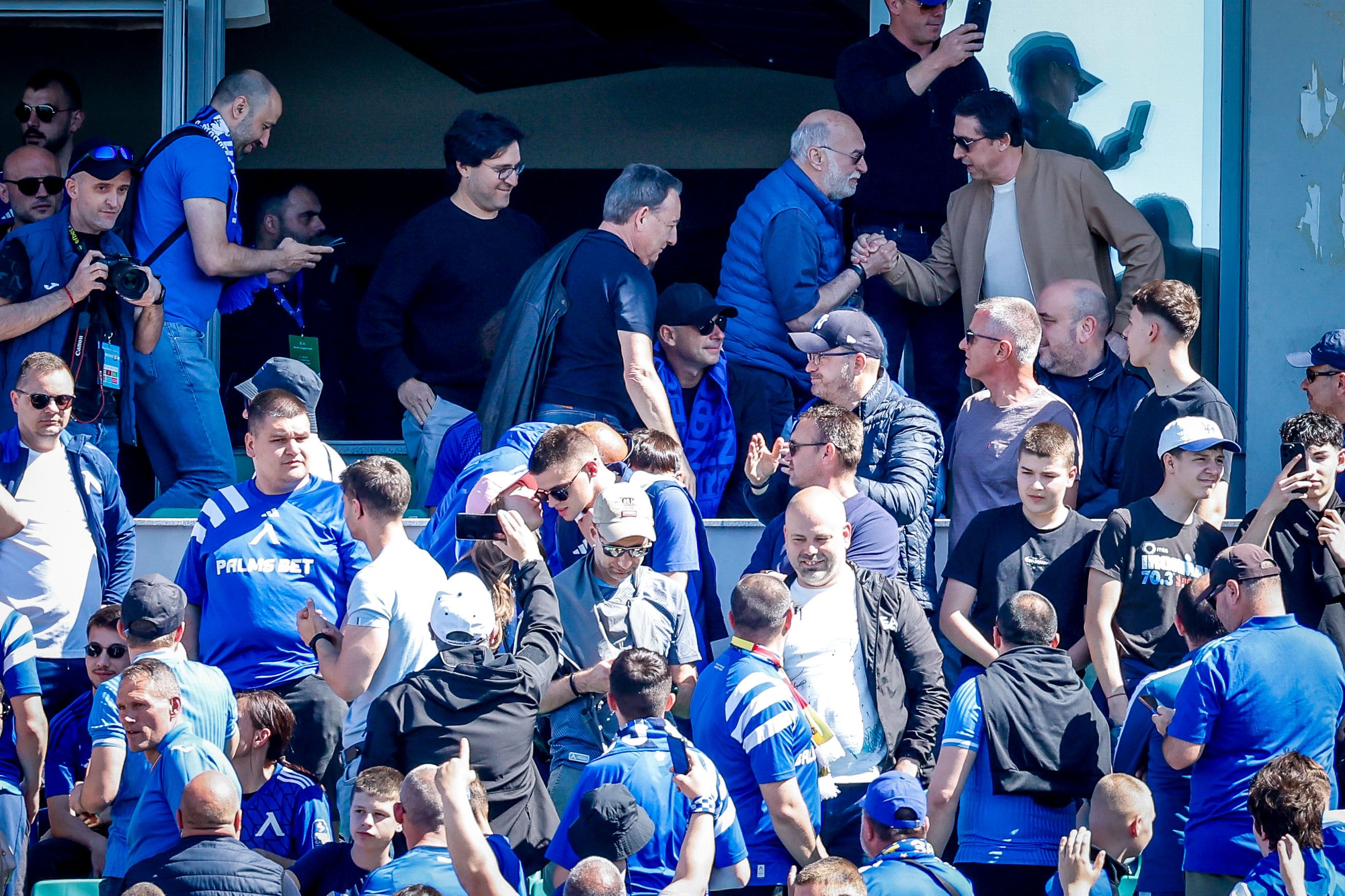 "Синята" публика приветства Бостанджиев и го засипа с аплодисменти. Босът е с шал на "сините" и зае място в официалната ложа на сектор В, заедно със своя син.