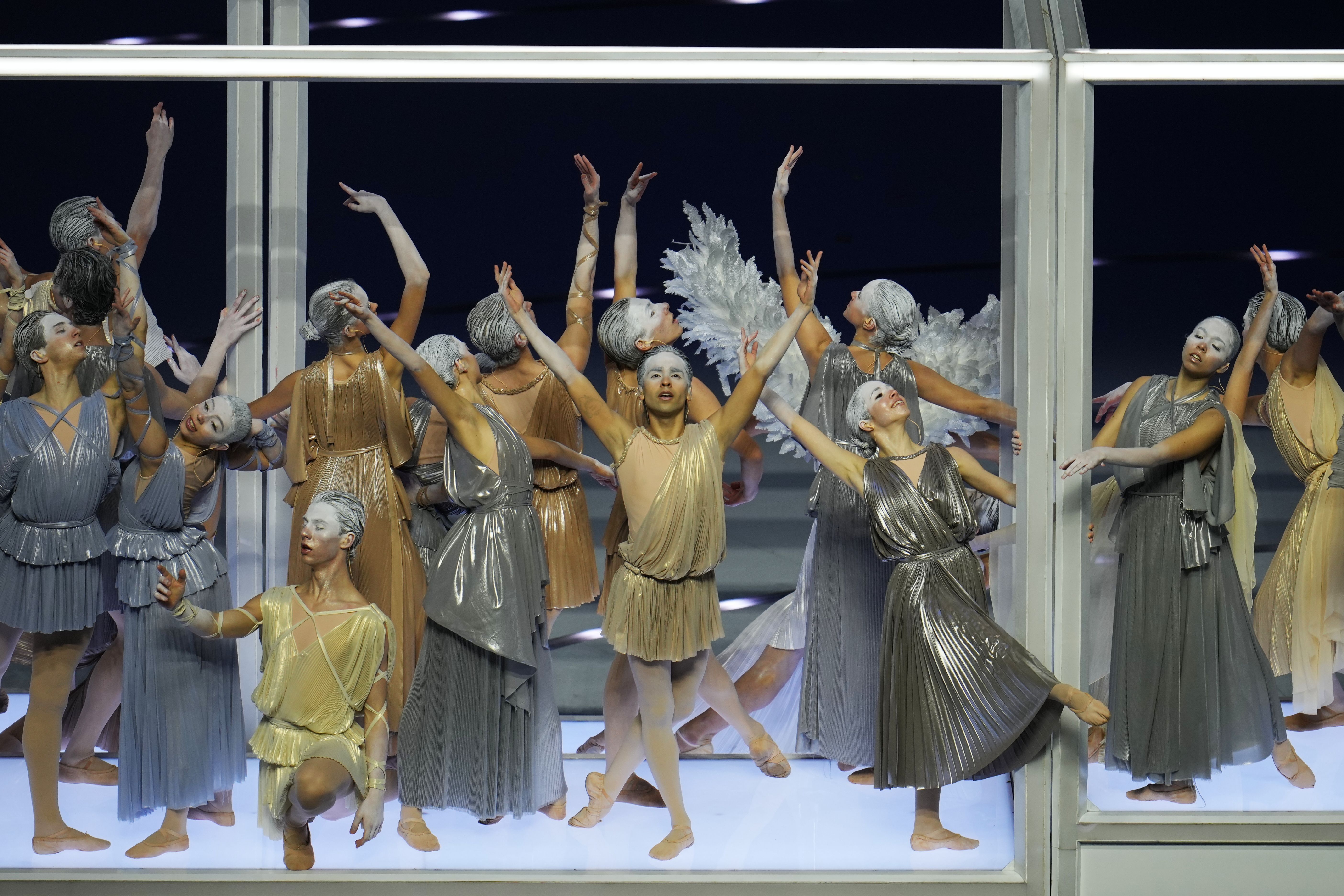 Първата световна звезда в програмата бе Марая Кери, която изпълни „Nel Blu, dipinto di Blu“ – „Volare“, превръщайки класиката на Доменико Модуньо в един от музикалните акценти на вечерта. Малко по-късно зрителите видяха специално подготвено видео, в което легендата на моторните спортове Валентино Роси се превъплъти във ватман и „докара“ президента на Италия Серджо Матарела на „Сан Сиро“.Протоколната част бе белязана от издигането на италианския флаг едновременно в Милано и Кортина. Италианският химн прозвуча в изпълнение на Лаура Паузини, облечена в тоалет на Джорджо Армани, докато около нея десетки артисти с костюми на модната къща оформиха сценична композиция. В Кортина химнът бе изпълнен от планински хор. С атрактивна хореография на терена бяха „сглобени“ и петте олимпийски кръга, които се издигнаха високо над стадиона като символ на петте континента и единството между народите.